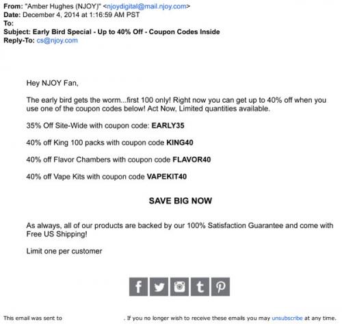 Email from NJOY promoting an Early Bird Special for the first 100 customers.