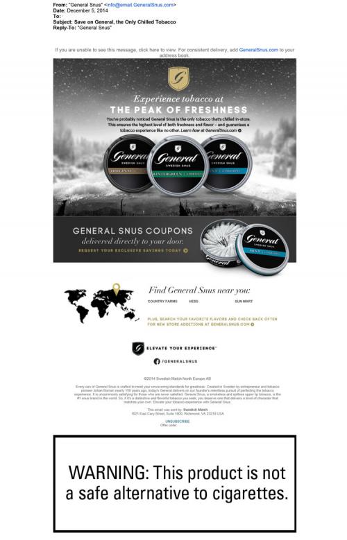 Email from General Snus received December 5, 2014 promoting their chilled tobacco and inviting the recipient to the brand website to request coupons and find a local retailer. Text: "Experience tobacco at the peak of freshness. You've probably noticed General Snus is the only tobacco that's chilled in-store. This ensures the highest level of both freshness and flavor-and guarantees a tobacco experience like no other."