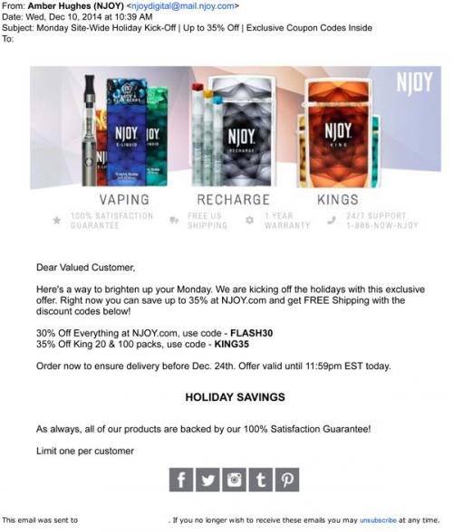 NJOY starts "kicking off the holidays" on December 10, 2014 with a limited time discount code.