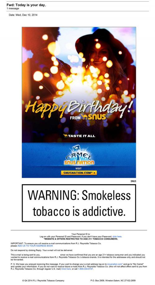 Email from Camel Snus received in December 2014 wishing the receiver a happy birthday. The email includes a colorful image of a young woman in the background, and a link to visit the brand's website.