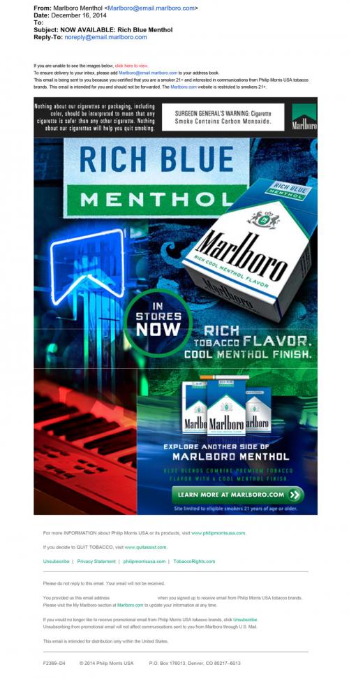 Email received from Marlboro Menthol December 16, 2014 promoting a new "rich blue menthol" flavor that is now in stores. The email invites the recipient to learn more at Marlboro.com.