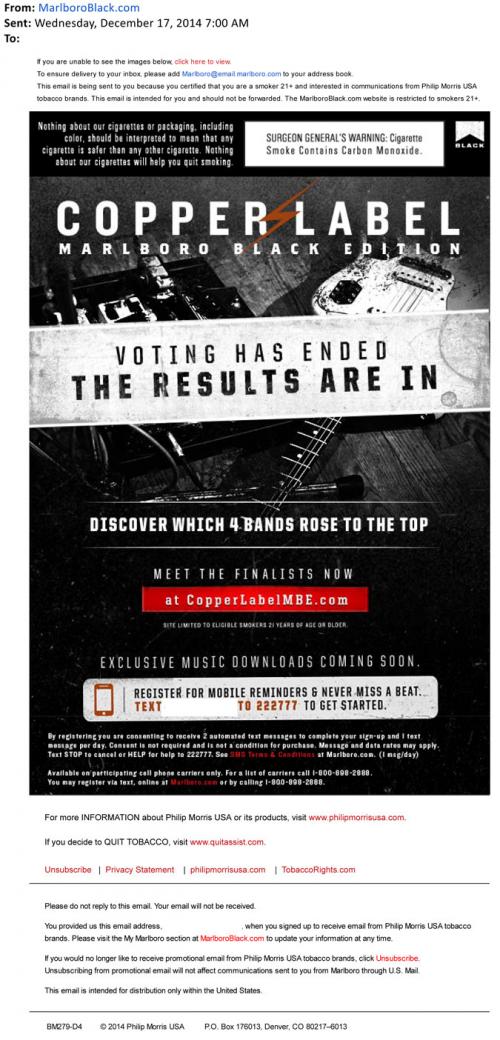 Email from Marlboro promoting the end of the Copper Label Battle of the Bands sweepstakes. The email invites the recipient to the brand website to see the finalists and also has a reminder that music downloads will soon be available. Has an option to register for mobile reminders via text.