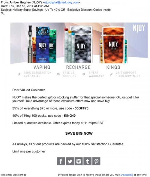Email from NJOY in December 2014 promoting their holiday sale with their products pushed as "the perfect gift or stocking stuffer."