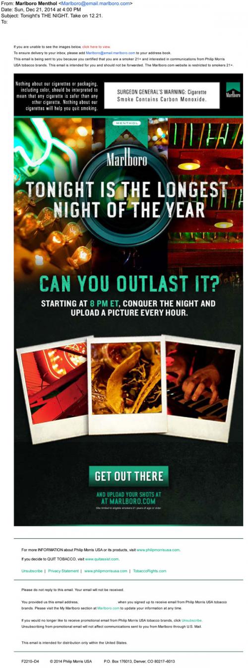 Email from Marlboro promoting their Longest Night event on December 21, 2014 where the recipient is invited to post photos of their nightlife experiences on the brand website every hour.