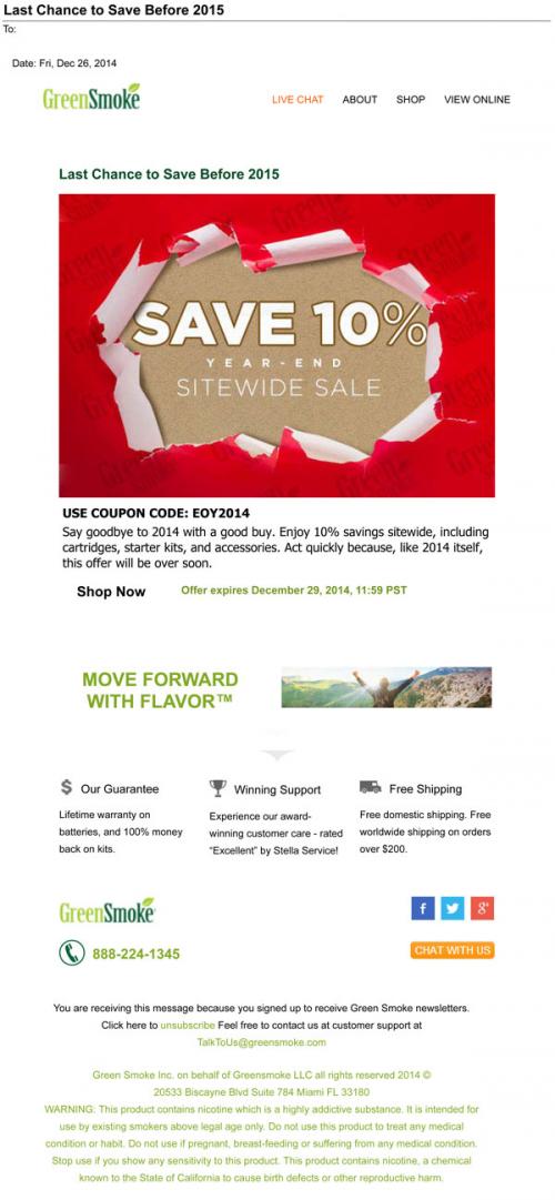 Email from GreenSmoke in December 2014 promoting their year-end website sale.
