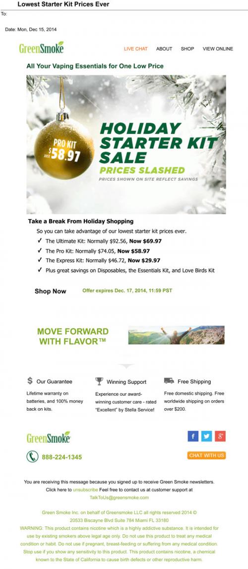 Email from GreenSmoke in December 2014 promoting their Holiday Starter Kit sale where they offer discounted vaping kit prices. The email included an animated .gif of a Christmas ornament.
