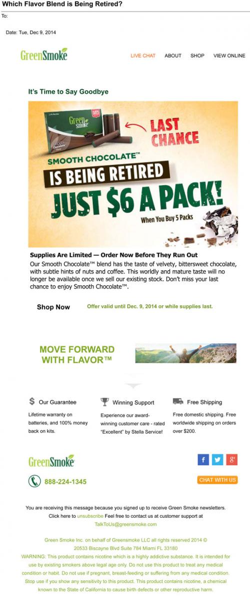 Email from GreenSmoke in December 2014 announcing the retirement of their "Smooth Chocolate" flavored product. The email offers a discount when multiple packs are purchased.