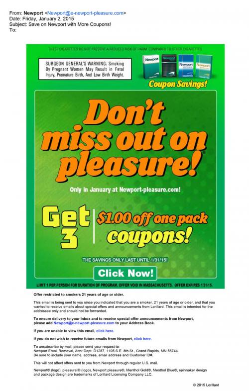 Email received from Newport January 2015 inviting recipient to the brand website to claim their coupons while the offer lasts. Text: "Don't miss out on pleasure! Only in January at Newport-pleasure.com! Get 3 $1.00 off one pack coupons!"