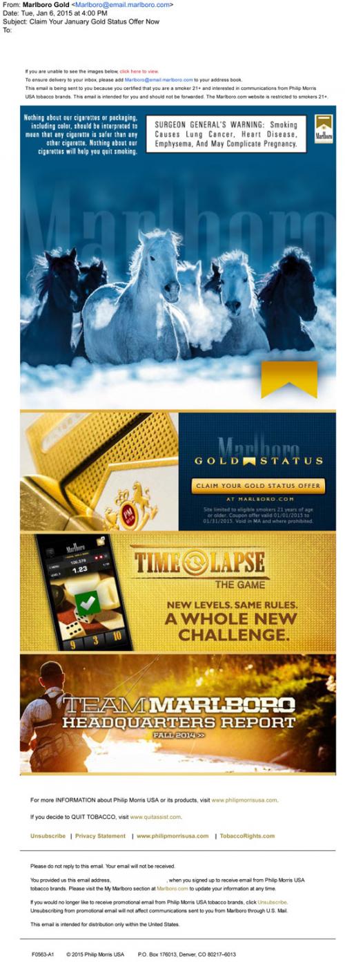 Email from Marlboro in January 2015 with a Gold Status offer. Also invites the recipient to play the new levels of the Time Lapse game and read the Team Marlboro report on the brand website.