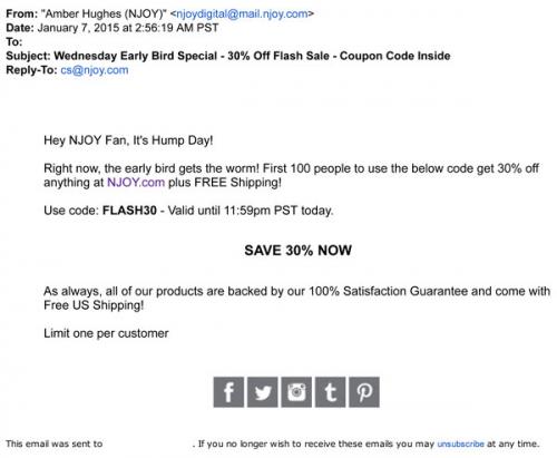 Email from NJoy announcing a Wednesday "Early Bird Special" limited-time offer.