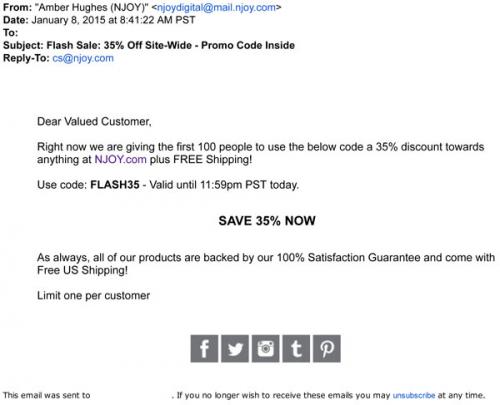 Email received from NJOY January 2015 informing recipient of a flash sale. The first 100 people to use the discount code will receive 35% off anything at NJOY.com