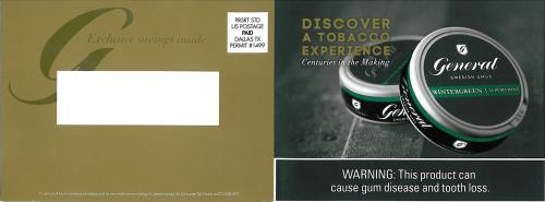 Direct mail from General Snus delivering two coupons. Folding mail piece has a picture of the product on the back and a historical timeline of tobacco and the General Snus company on the inside. The mailing invites the recipient to visit the brand website or the product site on Facebook, and also includes the addresses of local retailers. Text: "Discover a tobacco experience centuries in the making" and "It took generations to become General"