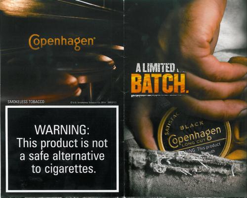 Direct mail piece promoting the Copenhagen Black Long Cut product. The product is advertised as "the barrel-aged seasonal batch made for the men who've worked hard all year." Images include a working man's rough hands, work gloves, a bar and an empty tumbler. The mailing includes two coupons for Copenhagen products and came in a plain black slipcover.