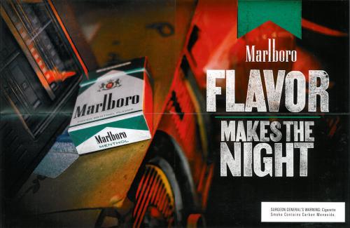 Direct mail from Marlboro Menthol, "Flavor makes the night." Includes two coupons and an invitation to visit the brand website and play the new poker game Five-card Draw by scanning a QR code with your phone. Text: "Tonight's adventure, tomorrow's story."