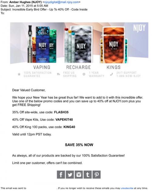 Email from NJoy sending extended New Year's greetings and promoting an "incredible offer." Includes discount codes valid for a limited time.