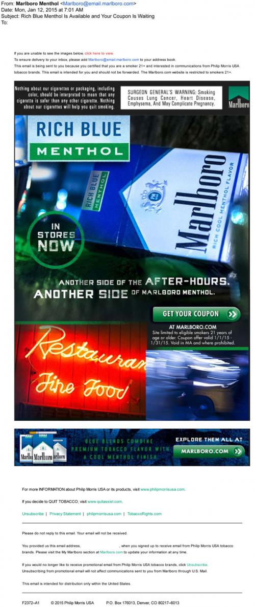 A similar email promotion sent by Marlboro to introduce their Rich Blue Menthol product, except this one also invites the recipient to the brand website to claim a coupon as well.