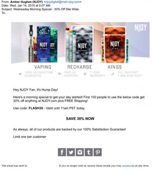 A limited time offer promo code from NJOY for "hump day." Text: "Here's a morning special to get your day started!"