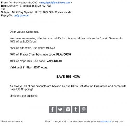 Email from NJOY with discount codes for Dr. Martin Luther King day.