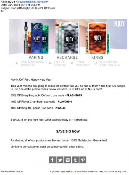 Email from NJOY wishing the recipient a Happy New Year and asking if they will be one of the millions making "the switch" in 2015. Codes are valid for the first 100 customers. Text: "Start 2015 on the right foot!"