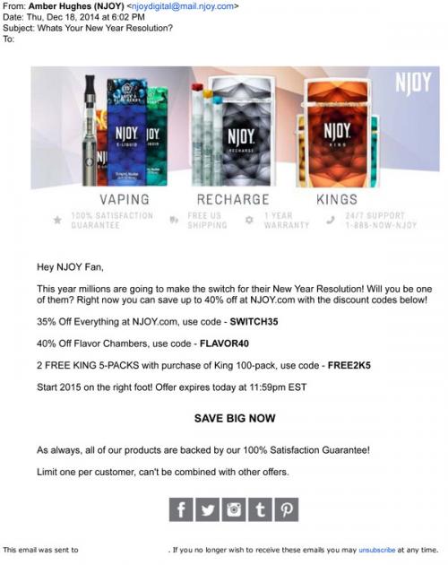 An email from NJOY tells the recipient that "millions are going to make the switch for their New Year Resolution!" Includes a code for 2 free 5-cartridge packs with the purchase of a 100-cartridge pack. Text: "Start 2015 on the right foot!"