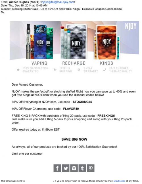 Email from NJOY reminding the recipient that their products make "the perfect gift or stocking stuffer!" Includes a discount code for a free 5-cartridge pack with the purchase of a 20-cartridge pack.
