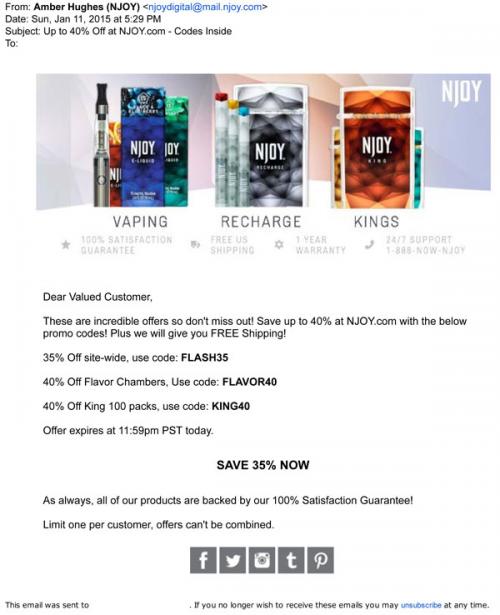 Email from NJOY reminding the recipient of some "incredible offers so don't miss out!" The customer can save up to 40% off products at the brand website.