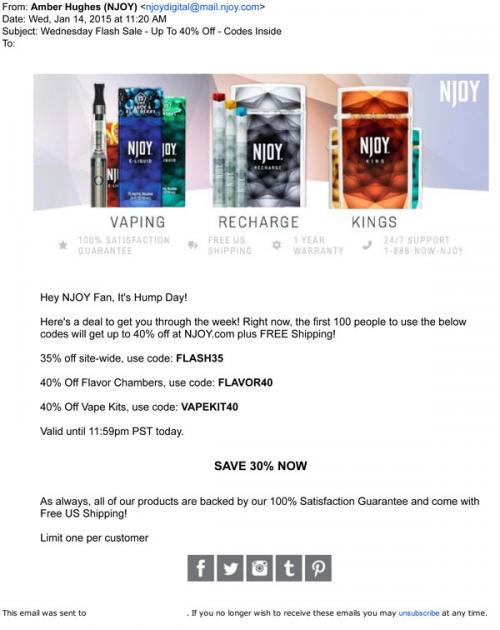 Email from NJOY with "a deal to get you through the week." Their Wednesday "hump day" flash sale offers discount codes limited to the first 100 customers on the brand website.