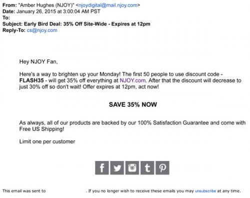 Email from NJOY with a "way to brighten up your Monday" - an early bird flash sale for 35% everything at the brand website for the first 50 people. Including a new gimmick - after that, the discount will decrease to 30%.