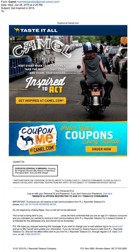 Email from Camel in January 2015 promoting their Inspired to Act project, where people are invited to the brand website to complete a weekly challenge. Also links to the brand website for the purpose of ordering monthly coupons.