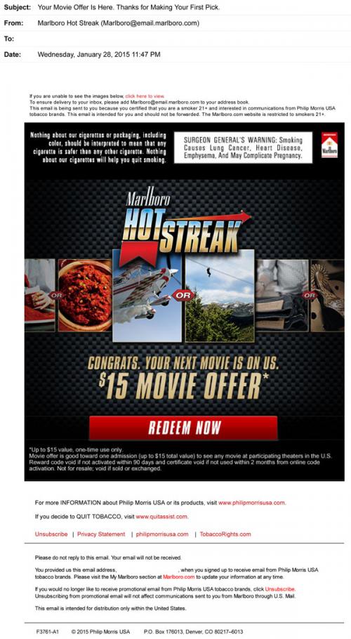Email from Marlboro thanking the recipient for playing the Hot Streak sweepstakes. The promotional gift is a 15$ gift certificate for participating movie theaters.