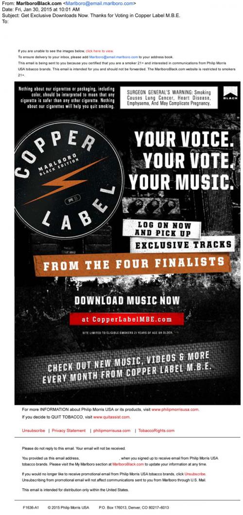 Email from Marlboro thanking the recipient for voting in the Copper Label Marlboro Black battle of the bands. The email invites the recipient to the brand website in order to download exclusive music tracks from the finalists in the contest. Text: "Your voice. Your vote. Your music."