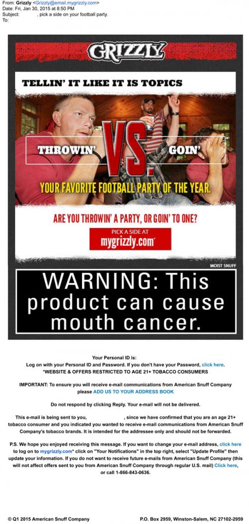 An email from Grizzly with a "Tellin' it like it is" topic for discussion on the brand website message boards. Grizzly wants to know if the recipient is "throwin' a party, or goin' to one" for Super Bowl Sunday and invites them to post about their favorite football party of the year.