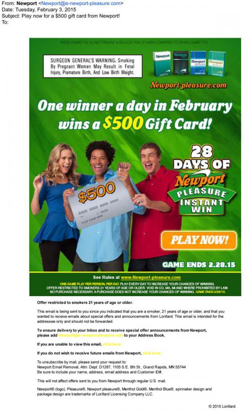 Email from Newport promoting their February 2015 "28 days of Newport Pleasure" sweepstakes, where visitors to the brand website have the chance to win a 500$ gift card every day.