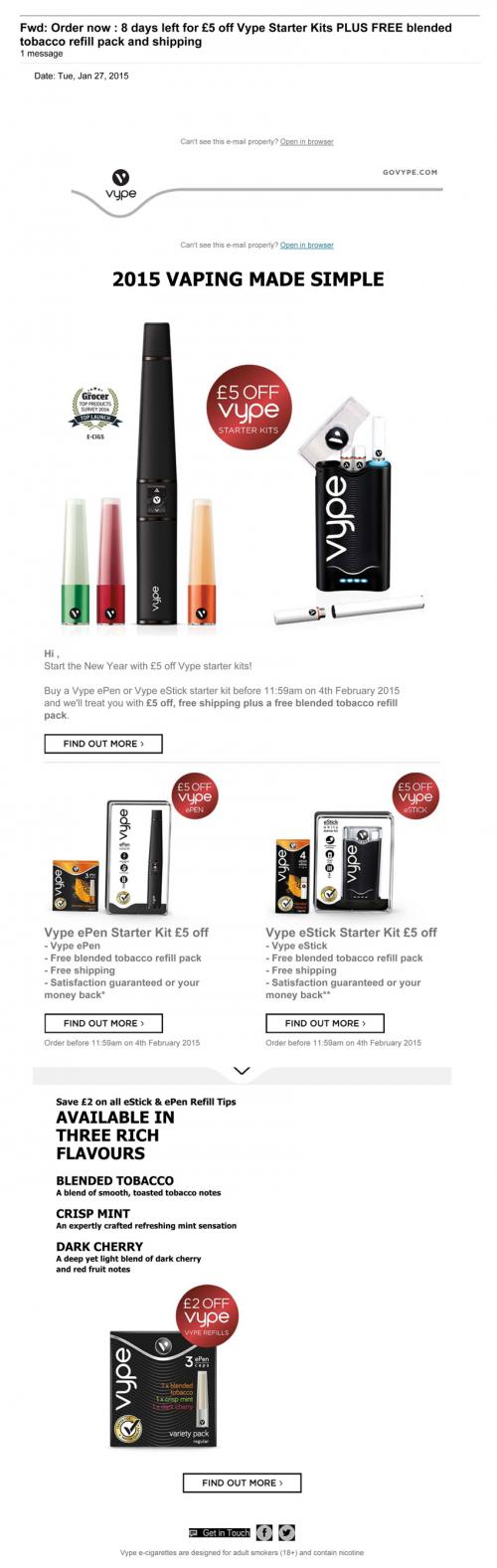 Email received from Vype informing recipient of a new year sale. Recipient can receive $5 off Vype starter kits, free shipping, plus a free blended tobacco refill pack.