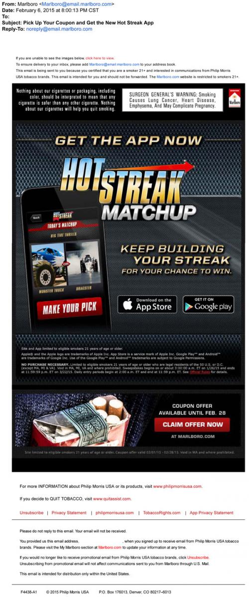 Email from Marlboro invites the recipient to get the app for the Hot Streak Matchup sweepstakes, for easy play on a mobile device. Also includes a link to the brand website for this month's coupon offer.