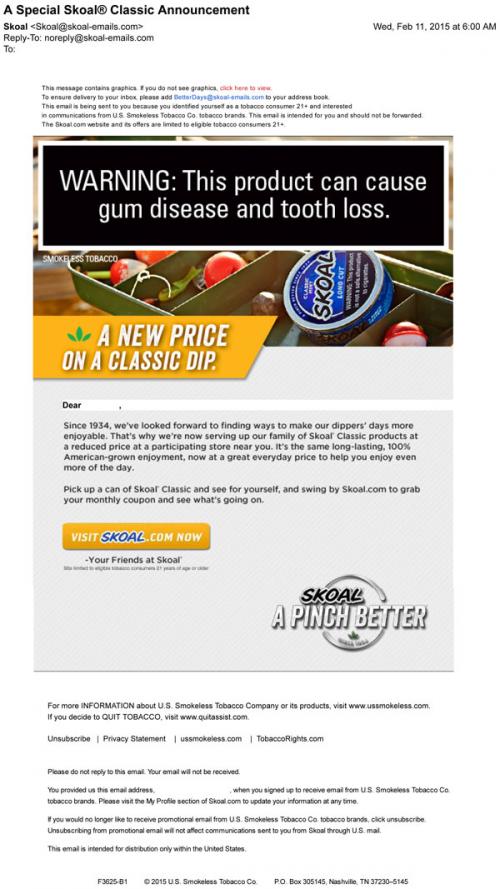 An email announcement from Skoal about reduced prices on their Classic products in time for their anniversary, at participating retail locations. They also invite the recipient to visit the brand website for a monthly coupon and to "see what's going on."