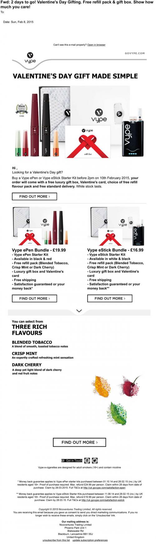 Email reminding the recipient about Vype's Valentine's Day promotion, where purchases of an ePen or eStick starter kit will come with free refills and in a special gift package. Also promotes their three flavors: blended tobacco, crisp mint, and dark cherry. Invites the recipient to the brand website to "find out more."