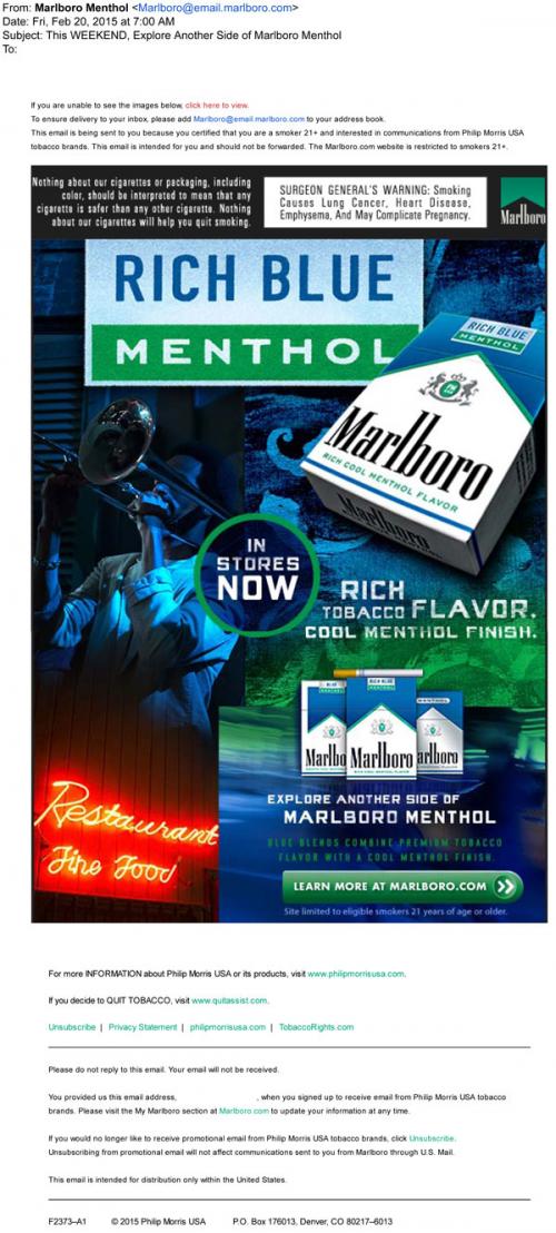Alternate email promoting Marlboro's Rich Blue Menthol products that does not include a coupon offer. Invites the recipient to the brand website to learn more about the product.
