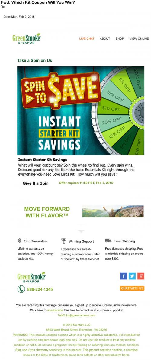 Green Smoke email invites the recipient to "Take a Spin on Us" on the brand website to get an instant discount on any of their product kits. Email included an animated GIF of a spinning wheel. Offer was limited to a day.
