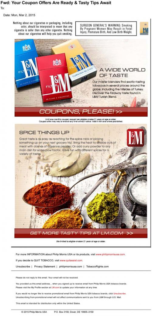 An email from L&M promoting their Turkish blend, including links to the brand website to claim coupons and get "tasty tips" on cooking with spices.