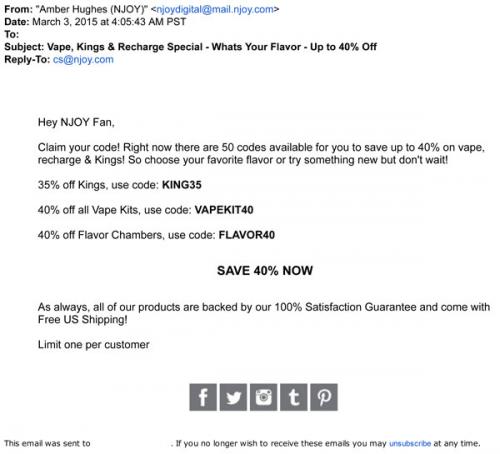 Email from NJOY urging the recipient to "claim your code!" and "don't wait!"