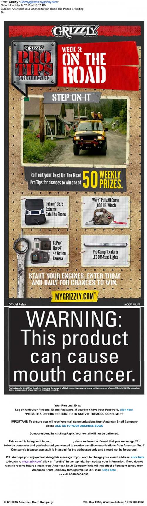 Email announcing week 3 of the Grizzly "Pro Tips" Challenge, featuring an "On the Road" theme. Participants who share tips on the brand website are entered to win prizes.