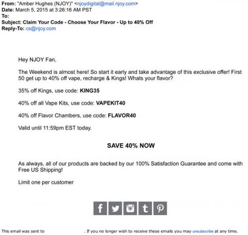 Email from NJOY announcing that "the weekend is almost here" with a limited time offer for the first 50 customers.