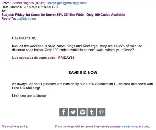 Email from NJOY with a Friday invitation to "kick off the weekend in style" with a limited number of discount codes.