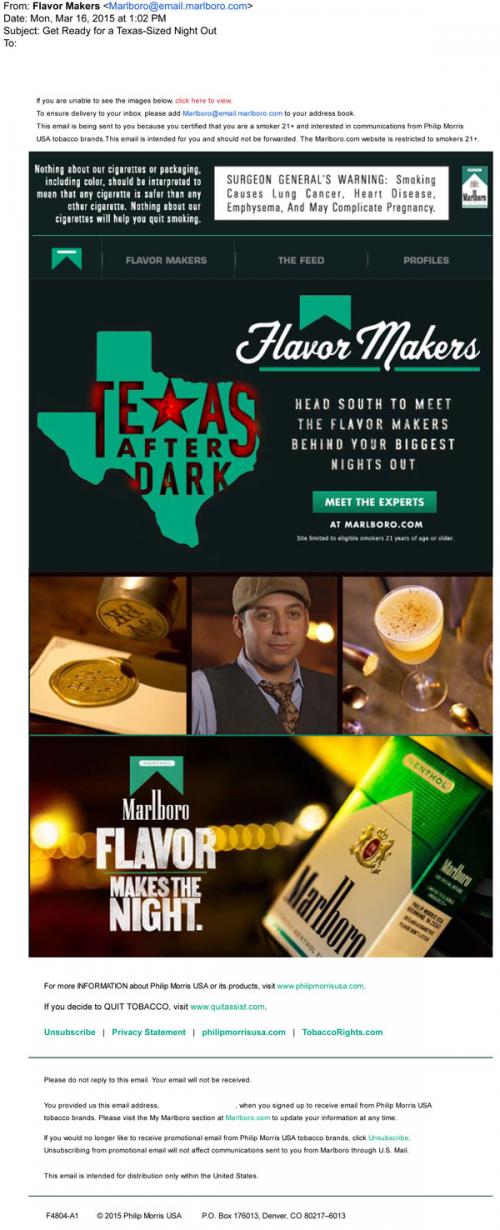 Email from Marlboro Flavor Makers inviting the recipient to "head south" to the brand website to meet some nightlife experts from the Texas After Dark feature.