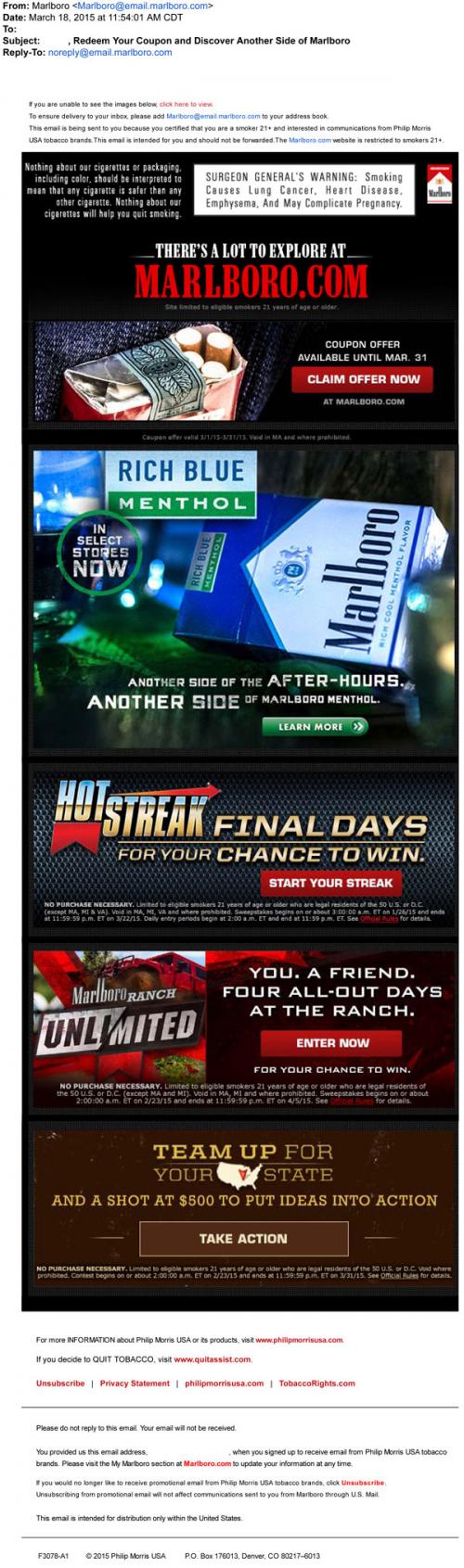 Marlboro email in March 2015 inviting the recipient to the brand website for the purposes of claiming coupons, learning more about their Rich Blue Menthol product, playing in the final days of the Hot Streak promotion, entering in the Ranch Unlimited sweepstakes, and submitting a project idea to Team Marlboro.