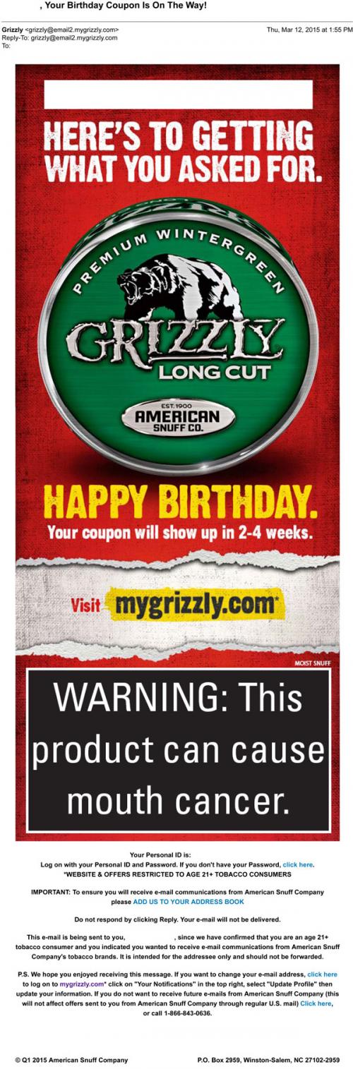 Birthday email from Grizzly letting the recipient know that a special coupon will be arriving via mail. Text: "Here's to getting what you asked for."
