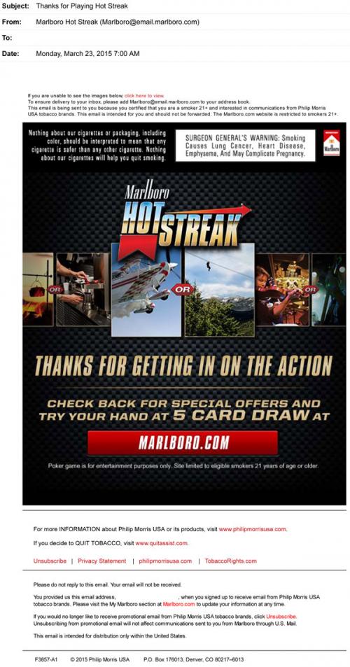 Email from Marlboro thanking the recipient for participating in the Hot Streak promotion; includes an invitation to try other activities on the brand website.