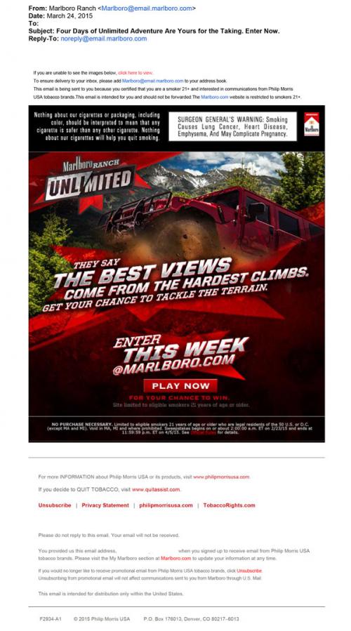 Email received from Marlboro March 2015 reminding recipient to enter the Marlboro Ranch Unlimited Sweepstakes. The email contains a direct link to the website for the recipient to enter. Text: "They say the best views come from the hardest climbs. Get your chance to tackle the terrain. Enter this week @Marlboro.com."