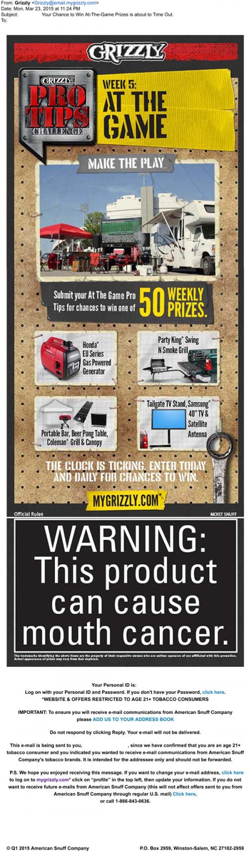 Grizzly email inviting the recipient to share their "At the Game" tips in the Pro Tips Challenge on the brand website. Prizes this week are for tailgate party accessories.